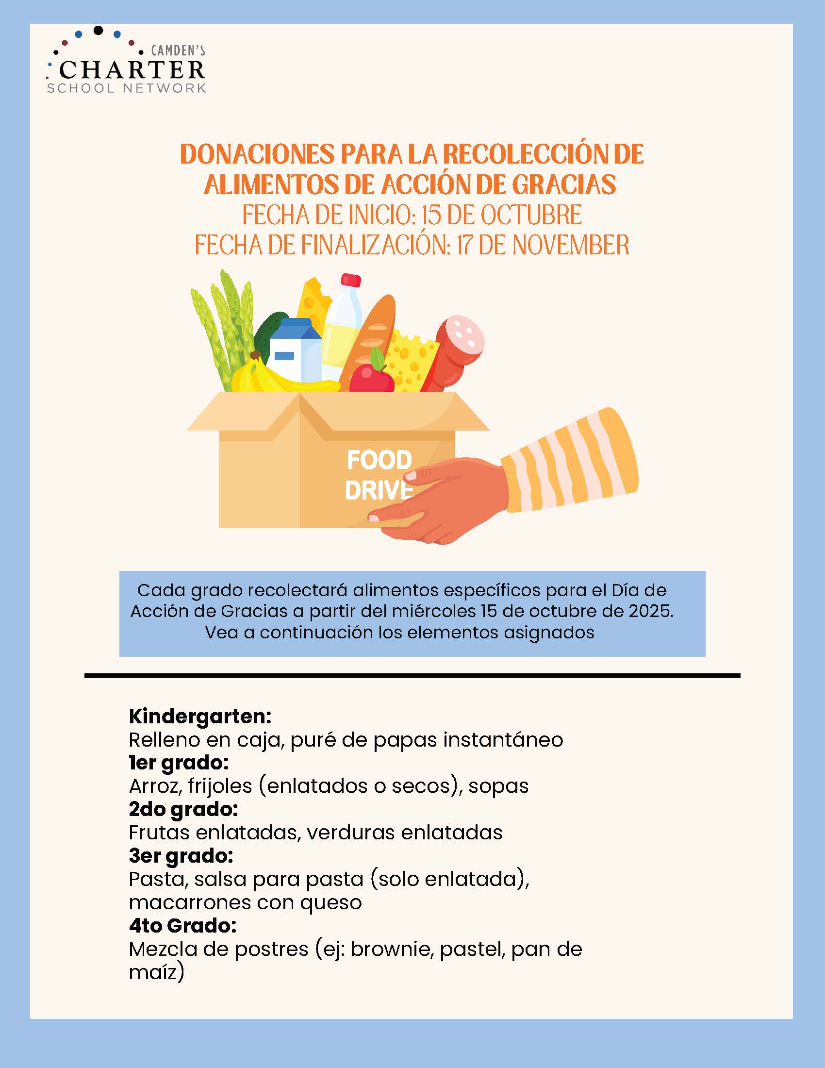 También está en marcha nuestra colecta de alimentos de Acción de Gracias. Invitamos a las familias a donar alimentos enlatados o artículos no perecederos para ayudar a quienes lo necesitan en esta temporada.