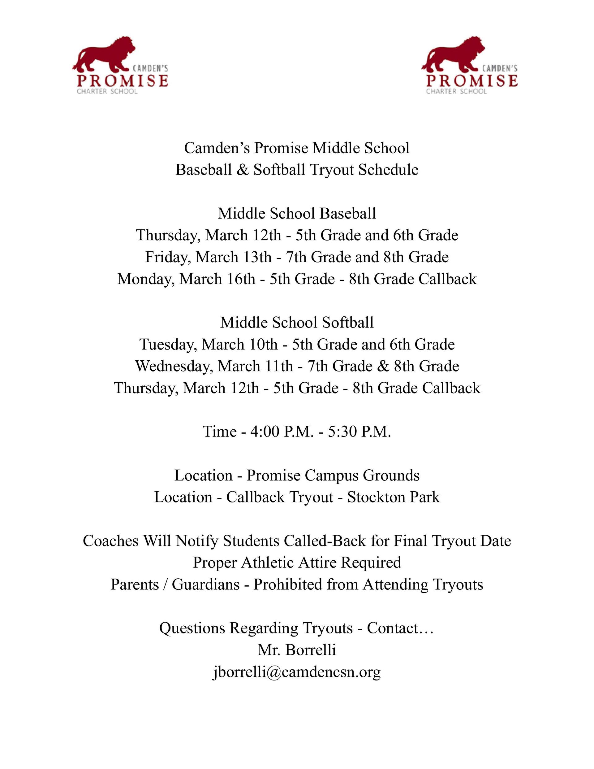 Promise: 5th-8th Grade Softball Callbacks; Baseball Tryouts 5th & 6th Tryouts